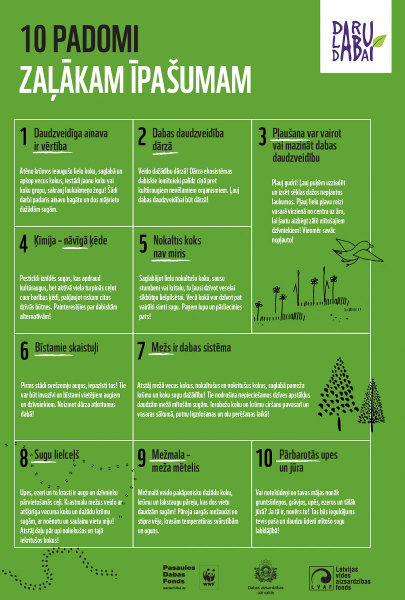 Latvijas dabā atrodamo vērtību saglabāšana prasa rūpes. Cilvēkiem, kuri mīl dabu un patīk atrasties brīvā dabā, Dabas aizsardzības pārvaldes un Pasaules dabas fonda kopīgā iniciatīva DARU LABU DABAI ir lieliska izdevība brīvprātīgi darīt labus darbus dabai, satikt jaunus cilvēkus un apgūt jaunas prasmes!