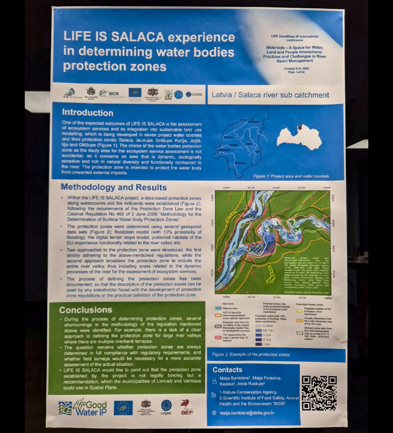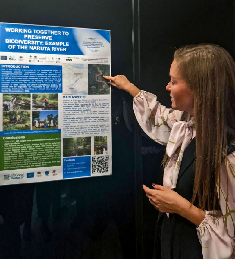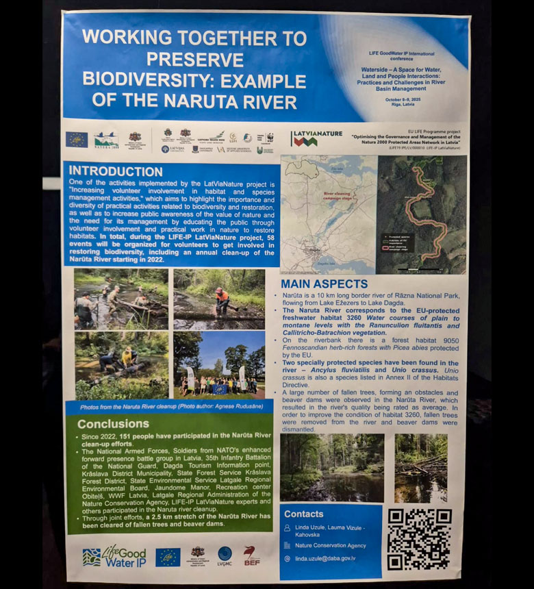 Dabas aizsardzības pārvaldes projekts LIFE projekti starptautiskajā konferencē “Ūdensmala – vieta ūdens, zemes un cilvēka mijiedarbei. Upju baseinu apsaimniekošanas prakse un izaicinājumi” prezentēja stenda referātus, daloties ar risinājumiem un praktisko pieredzi upju aizsardzības uzlabošanai - brīvprātīgo iesaisti biotopu un sugu apsaimniekošanā un ūdensteču aizsargjoslu noteikšanā.
