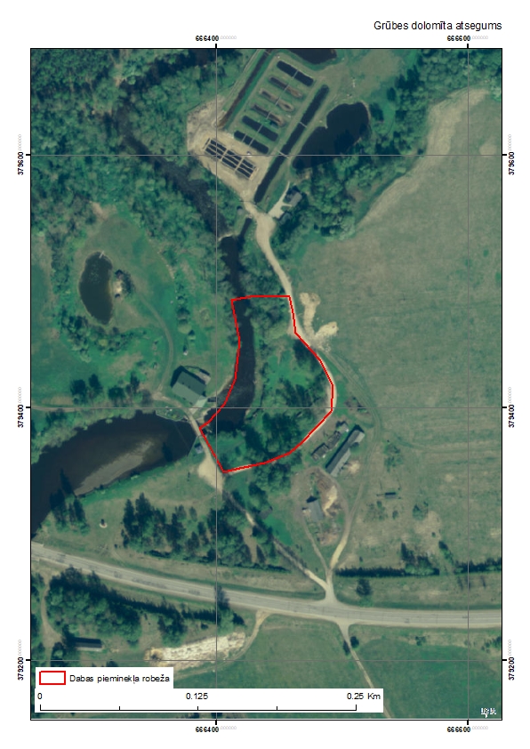 Dabas pieminekli 10 m augstajā Vaidavas upes krastā veido augšējā devona Franas stāva Pļaviņu svītas dolomītu atsegumi. Grūbes dolomīta atsegumu joslas garums ir 110 m. Atsegumu josla ir gandrīz nepārtraukta un vislielākais atsegums 4,5 m augstumā ir vērojams joslas ziemeļu daļā. Dolomītiem raksturīga slāņota uzbūve, dažāda biezuma plātnes, tie ir bagāti ar kavernām, kas veidojušās organismu atlieku šķīšanas rezultātā. Viens no samērā retajiem Pļaviņu svītas dolomītu atsegumiem Ziemeļvidzemē un viens no retajiem (lai gan neliels) Apes tipa dolomītu („apītu”) atsegumiem. Dolomītos labi novērojamas fosīlijas un sekundārie kalcīta kristāli.
