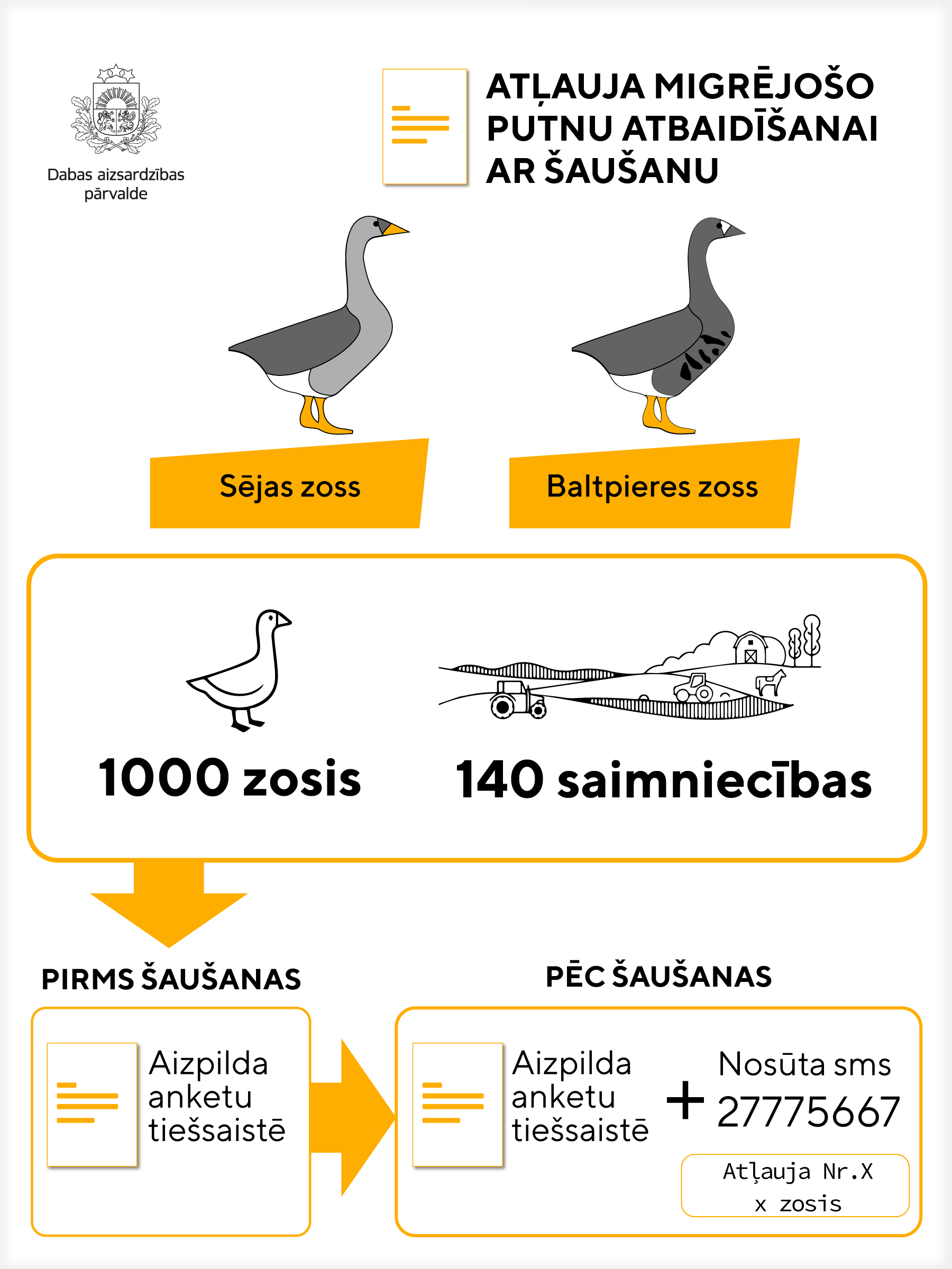 Zosu letālo atbaidīšanu nav atļauts izmantot īpaši aizsargājamās dabas teritorijās, kuras ir veidotas putnu aizsardzībai. Pieteikuma forma atļauju saņemšanai zosu indivīdu ieguvei 2022. gada pavasara migrācijas laikā pieejama Pārvaldes tīmekļa vietnes www.daba.gov.lv Pakalpojumu sadaļā.