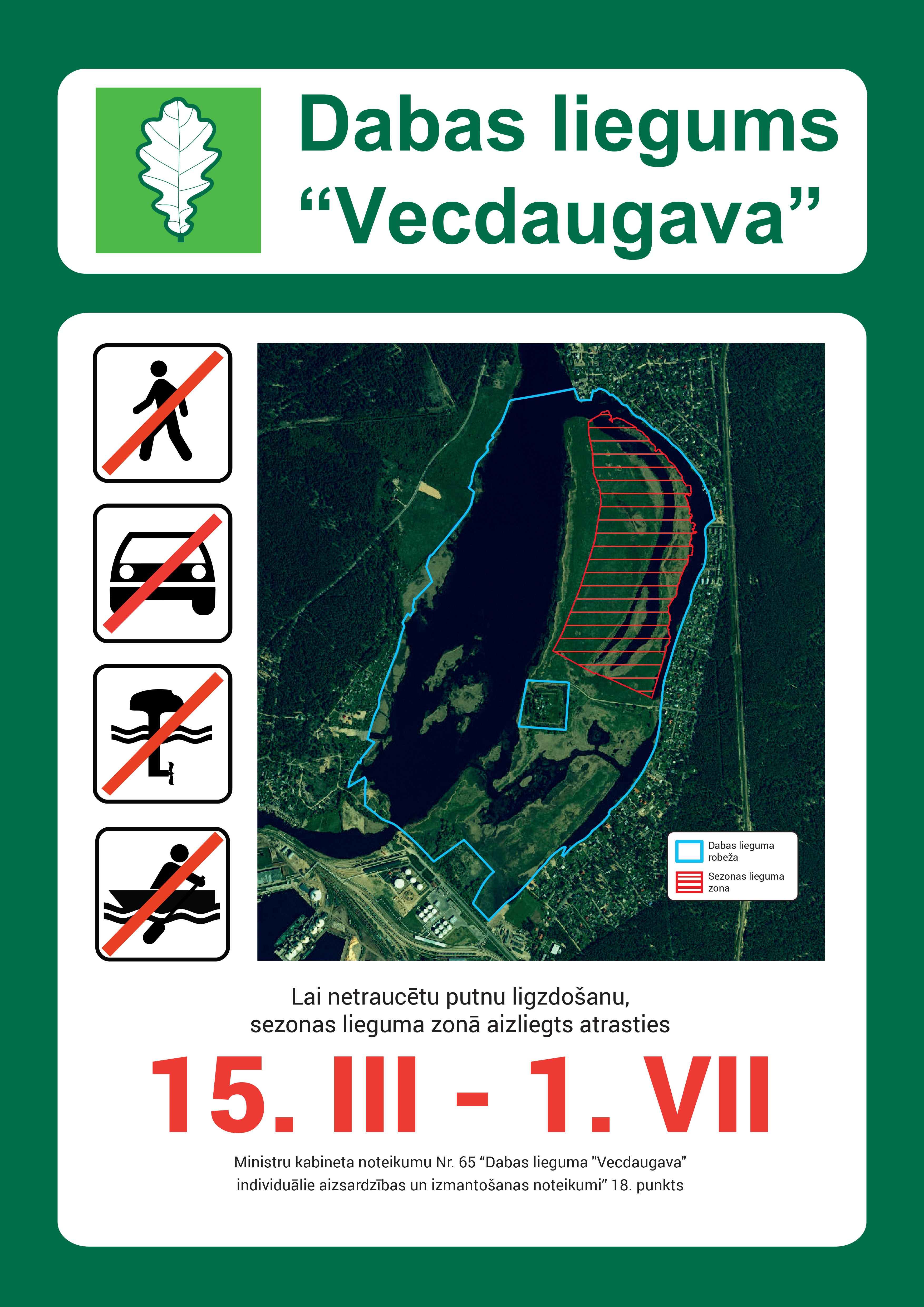 Liegums ir spēkā putnu ligzdošanas laikā no 1. maija līdz 31. jūlijam.